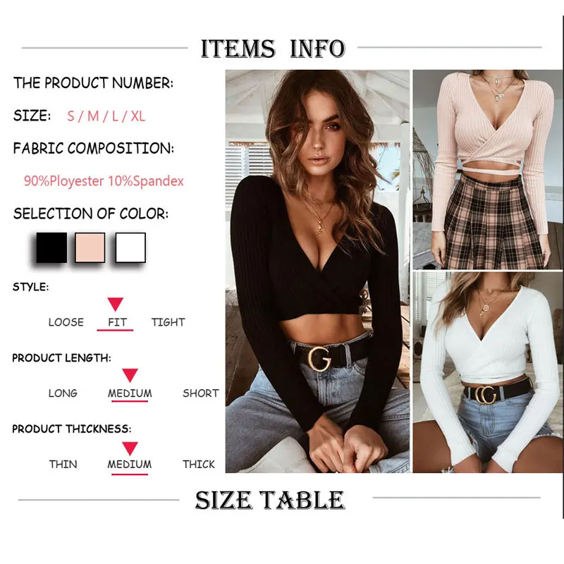 2018 Summer Women Slim T-shirt Black White Khaki Long Sleeve T shirt Cross V-neck Sexy Crop Top