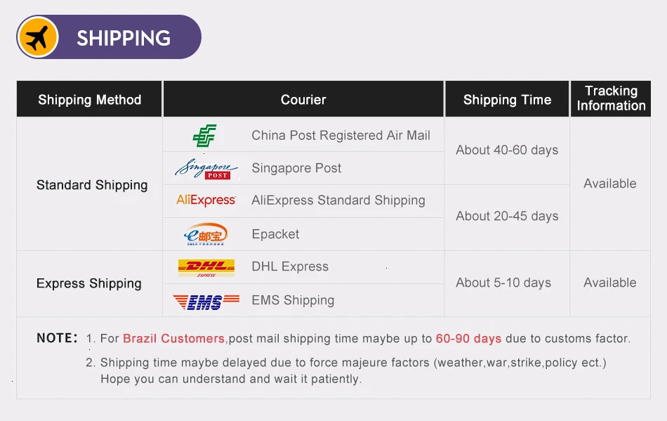 Packages from our warehouse in China will be shipped by ePacket or EMS depending on the weight and size of the product. Packages shipped from our US warehouse are shipped through USPS.
