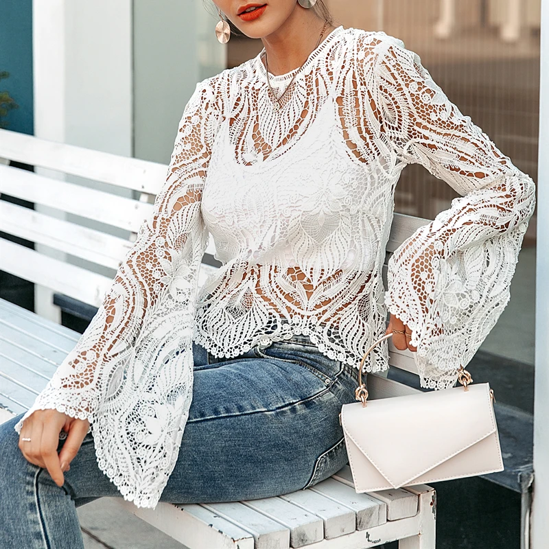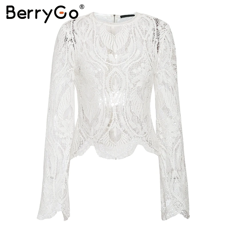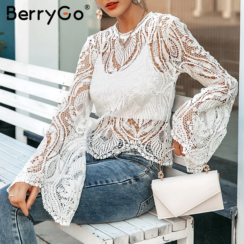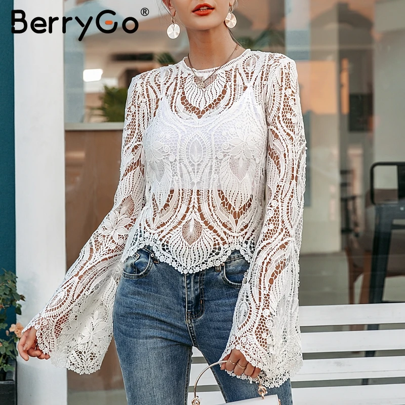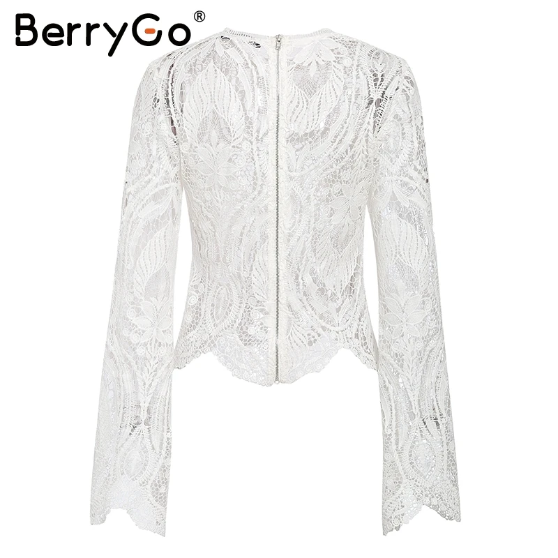BerryGo Sexy mesh lace embroidery women blouse Elegant hollow out flare sleeve female tops Party club transparent ladies shirts