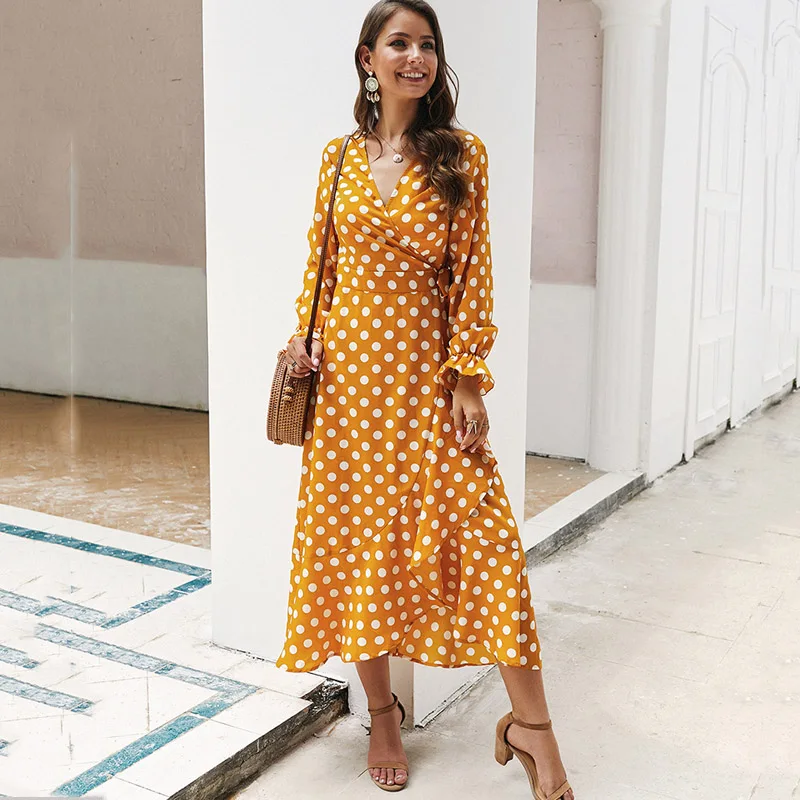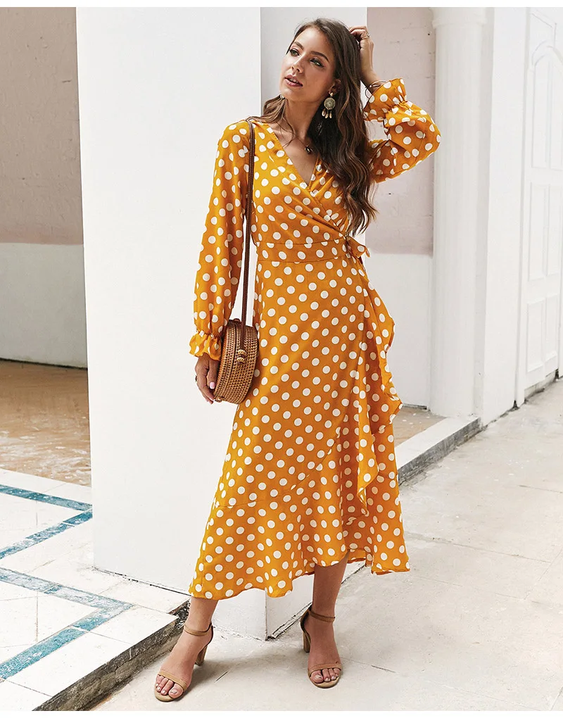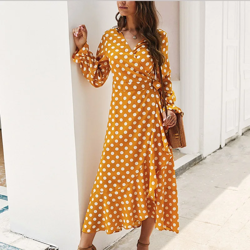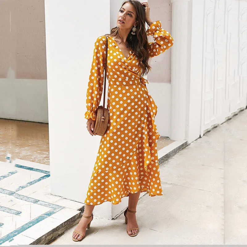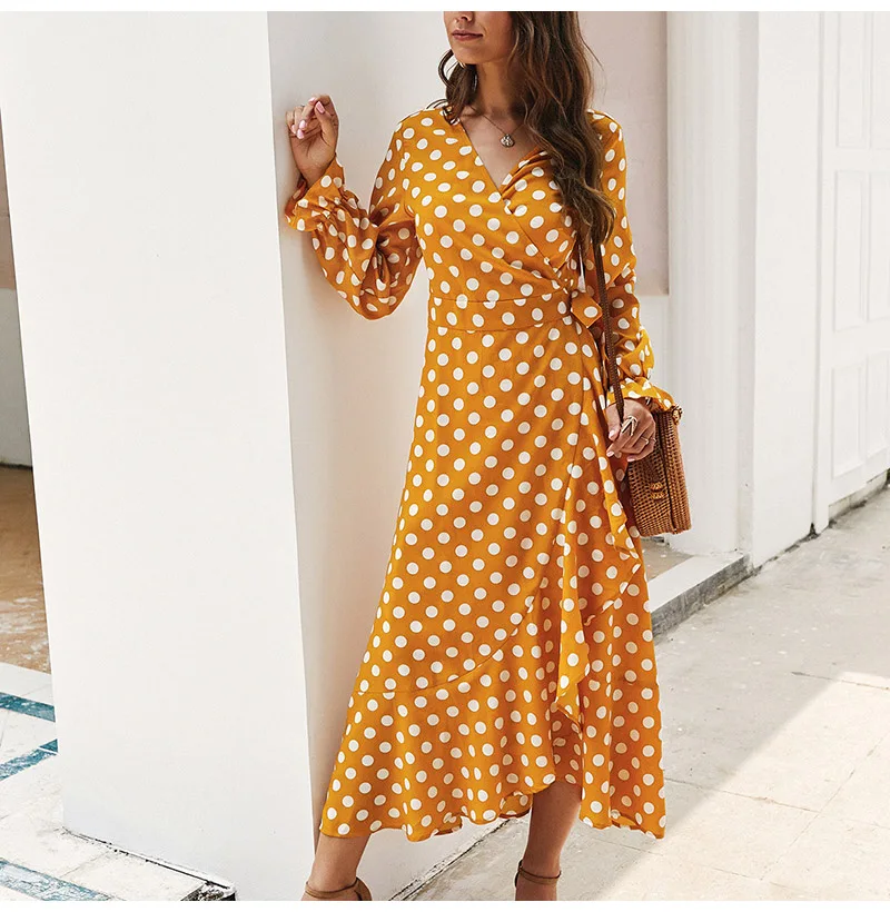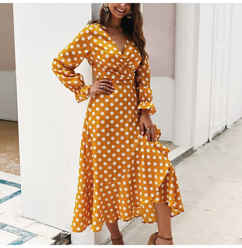 Lossky Women Long Dress Polka Dot Printed Long Sleeve Autumn Midi Ladies Dress Fashion V-neck Wrap Ruffled Yellow Slim Clothing