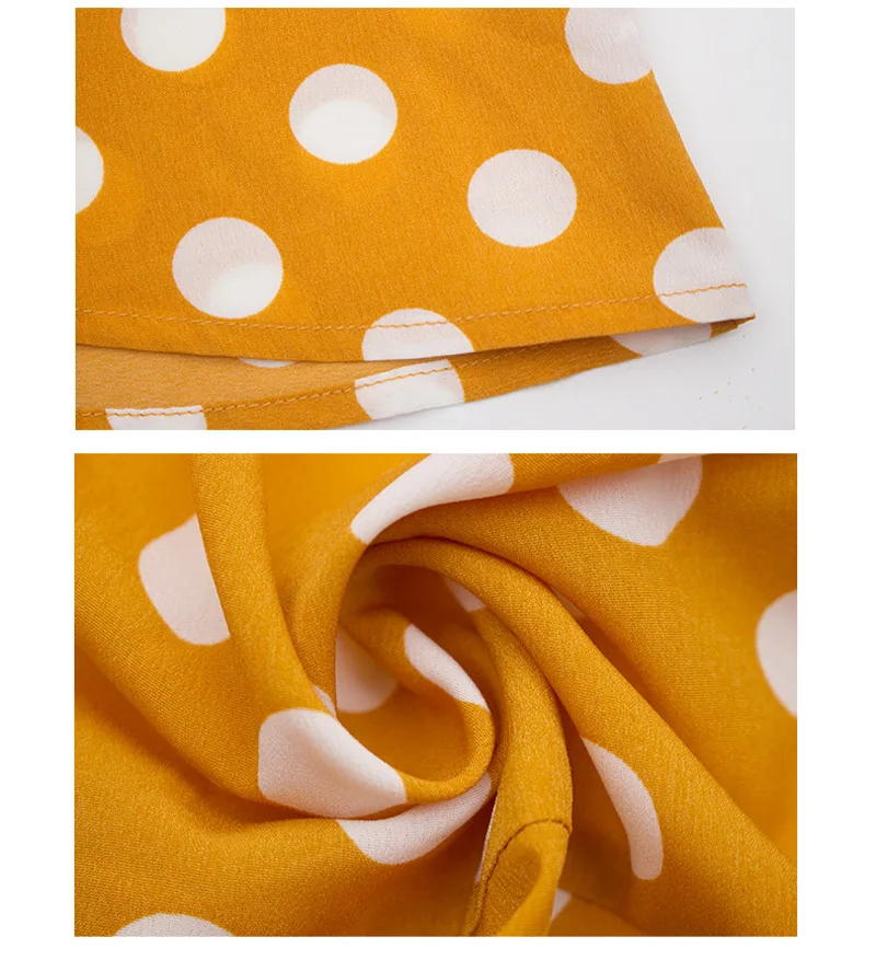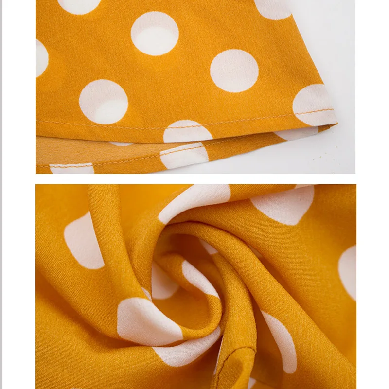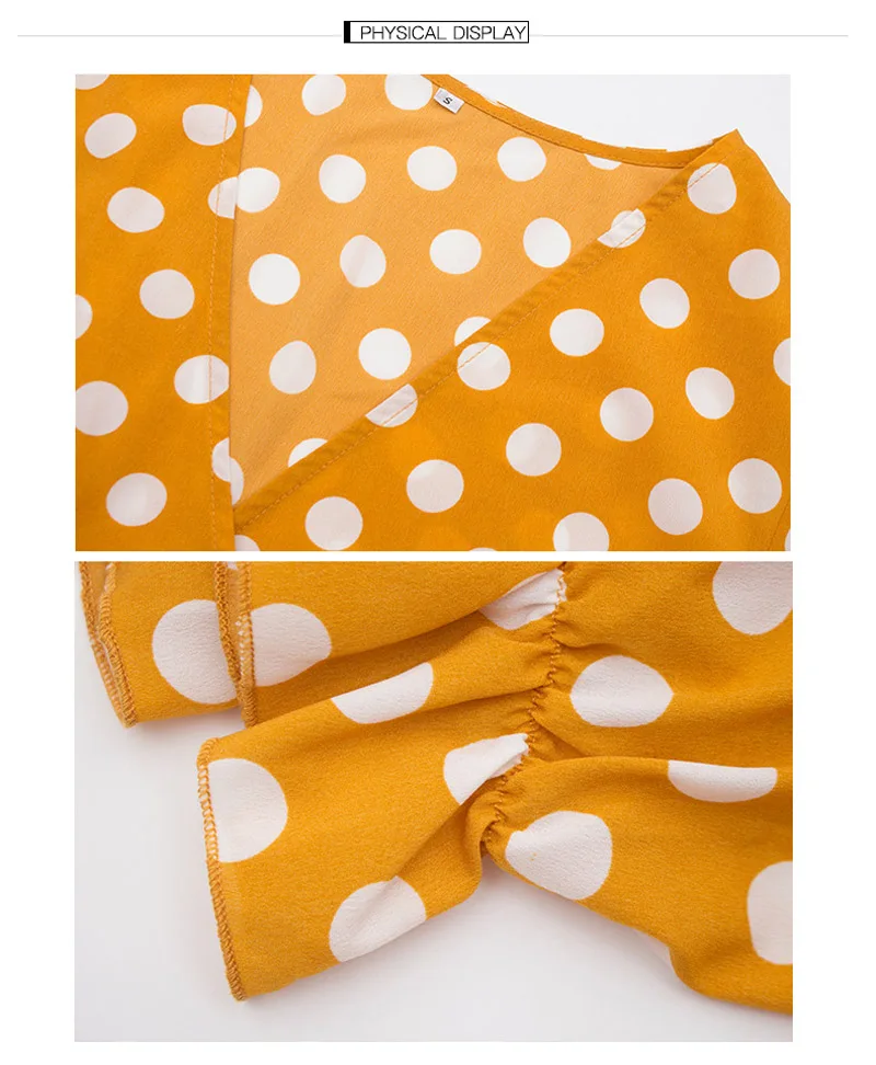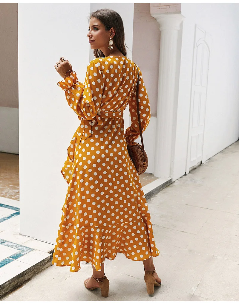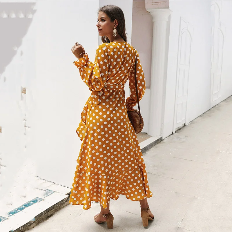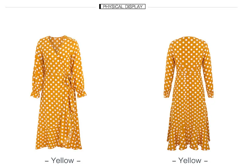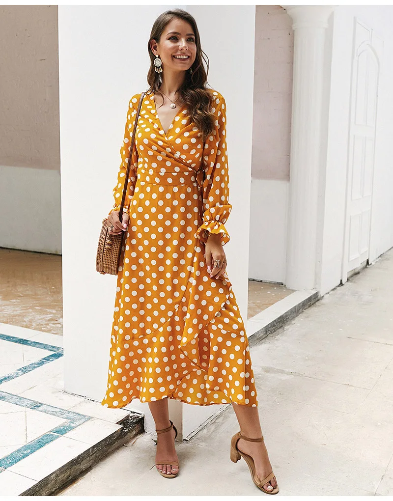 Lossky Women Long Dress Polka Dot Printed Long Sleeve Autumn Midi Ladies Dress Fashion V-neck Wrap Ruffled Yellow Slim Clothing