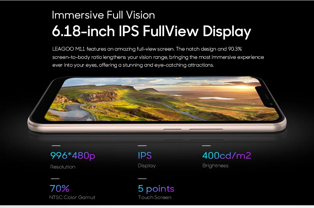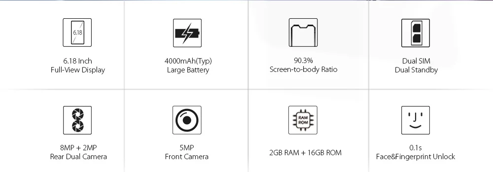 LEAGOO M11 4G Face ID OTG Smartphone 6.18″ U-shape Dual SIM Android 8.1 Quad Core 2GB RAM 16GB ROM 4000mAh Fingerprint Quad Core 1.28GHz Mobile Phone