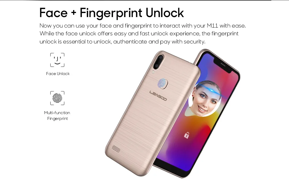 Original LEAGOO M11 4G Fingerprint Mobile Phone 6.18″ Dual SIM Android 8.1 Quad Core 2GB RAM 16GB ROM 4000mAh Face ID Smartphone