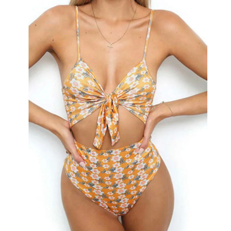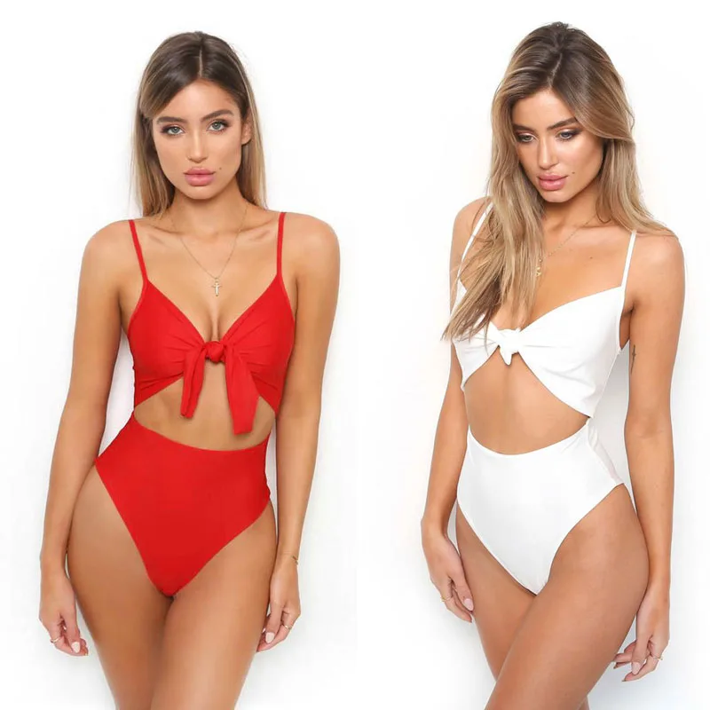 Summer Sexy Women One Piece Bikini 2018 Swimwear V-neck Bandage Bow Tie Backless Hollow out Swimsuit Swim Beachwear Bathing Suit