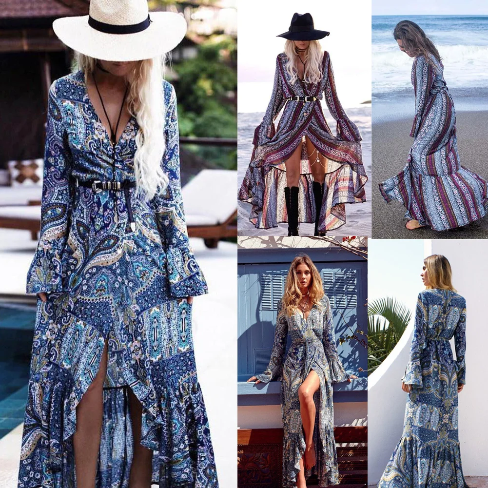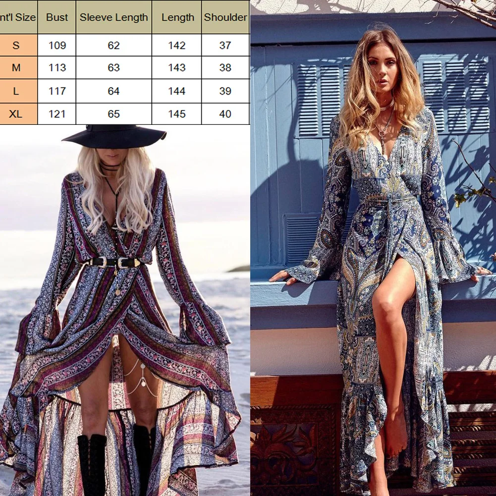 Vintage Bohemia Beach Dresses For Women Boho Floral Long Maxi Dress Loose Front Split Party Summer Beach Dress Women Cover Ups