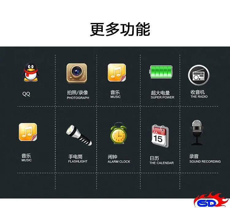 Functions: Power Bank/Camera/Torch/FM radio/Loud Speaker/Real Vibration/Bluetooth/Games/Calculator/Alarm/Calendar/Sound Recorder/Video Play/Driving Record/Audio Player…etc.